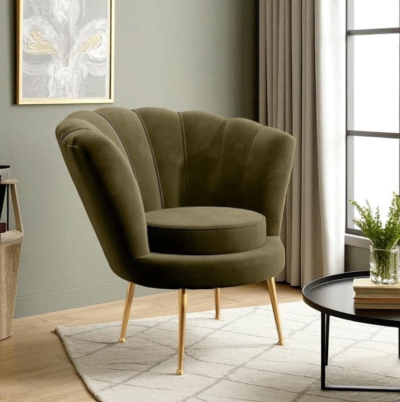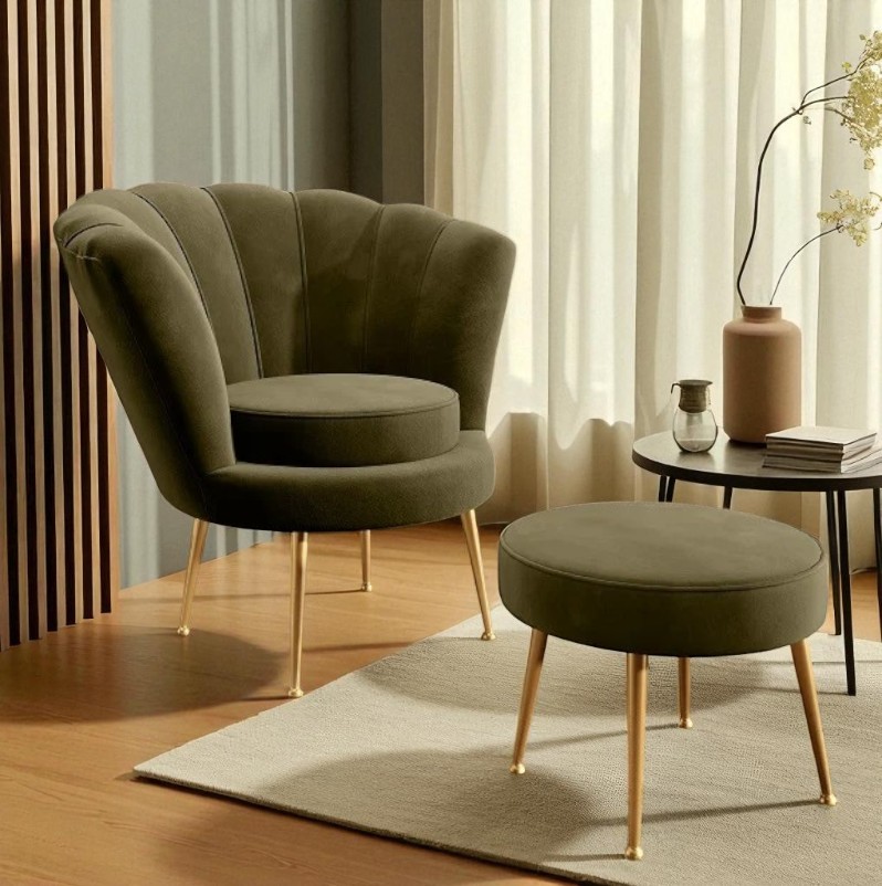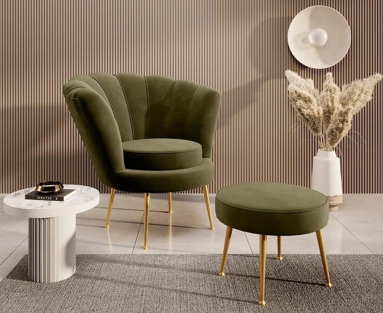 Fotel Muszelka Oliwkowy z Podnóżkiem – komfort i nowoczesny design