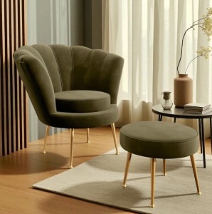 Oliwkowy fotel Muszelka z podnóżkiem wnosi do wnętrza świeży, elegancki akcent. Neutralny, stonowany odcień świetnie komponuje się z nowoczesnymi, minimalistycznymi aranżacjami, a także ociepla klasyczne i przytulne wnętrza. W połączeniu ze stolikiem kawowym lub ławą tworzy komfortowy i stylowy kącik do relaksu, który przyciąga wzrok i podnosi funkcjonalność salonu czy sypialni.