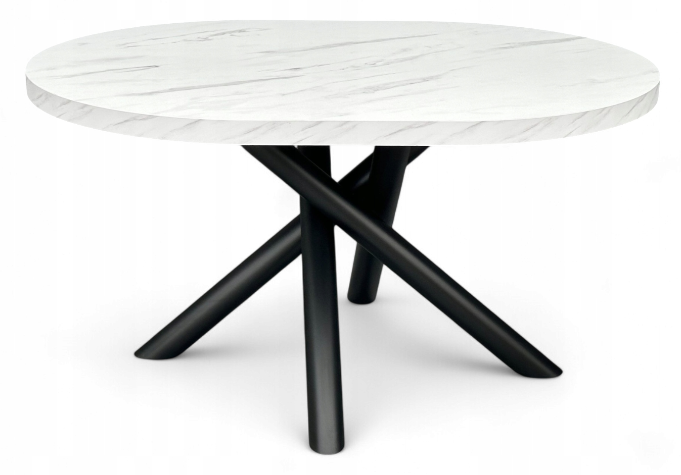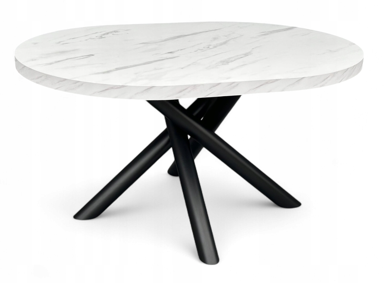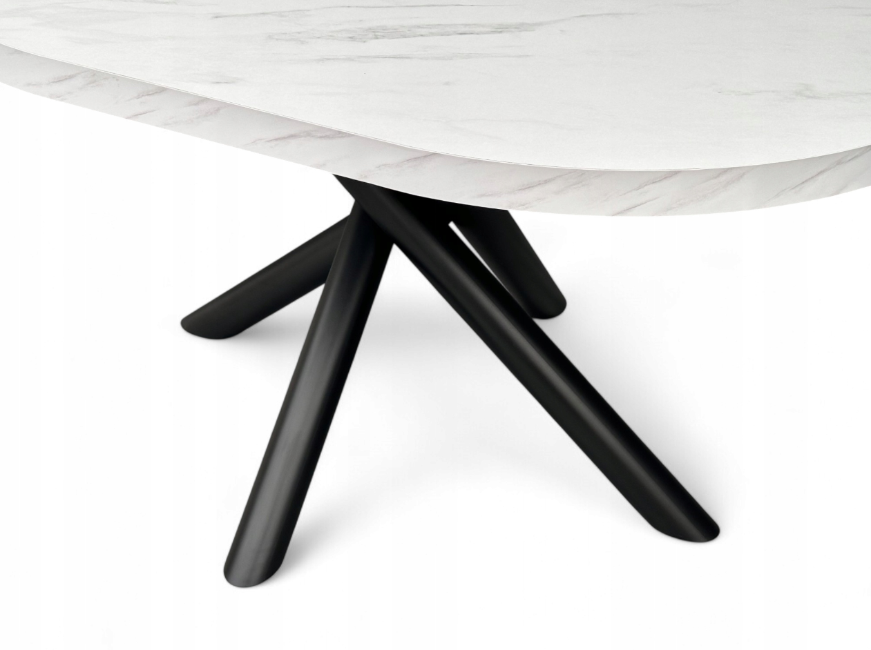 Owalny blat sprzyja spotkaniom rodzinnym i towarzyskim – każdy przy nim czuje się komfortowo. Połączenie marmurowego wzoru z czarnymi nogami doskonale pasuje do wnętrz w stylu nowoczesnym, minimalistycznym, loftowym czy industrialnym, a także kontrastuje z dodatkami w jasnych lub naturalnych odcieniach.