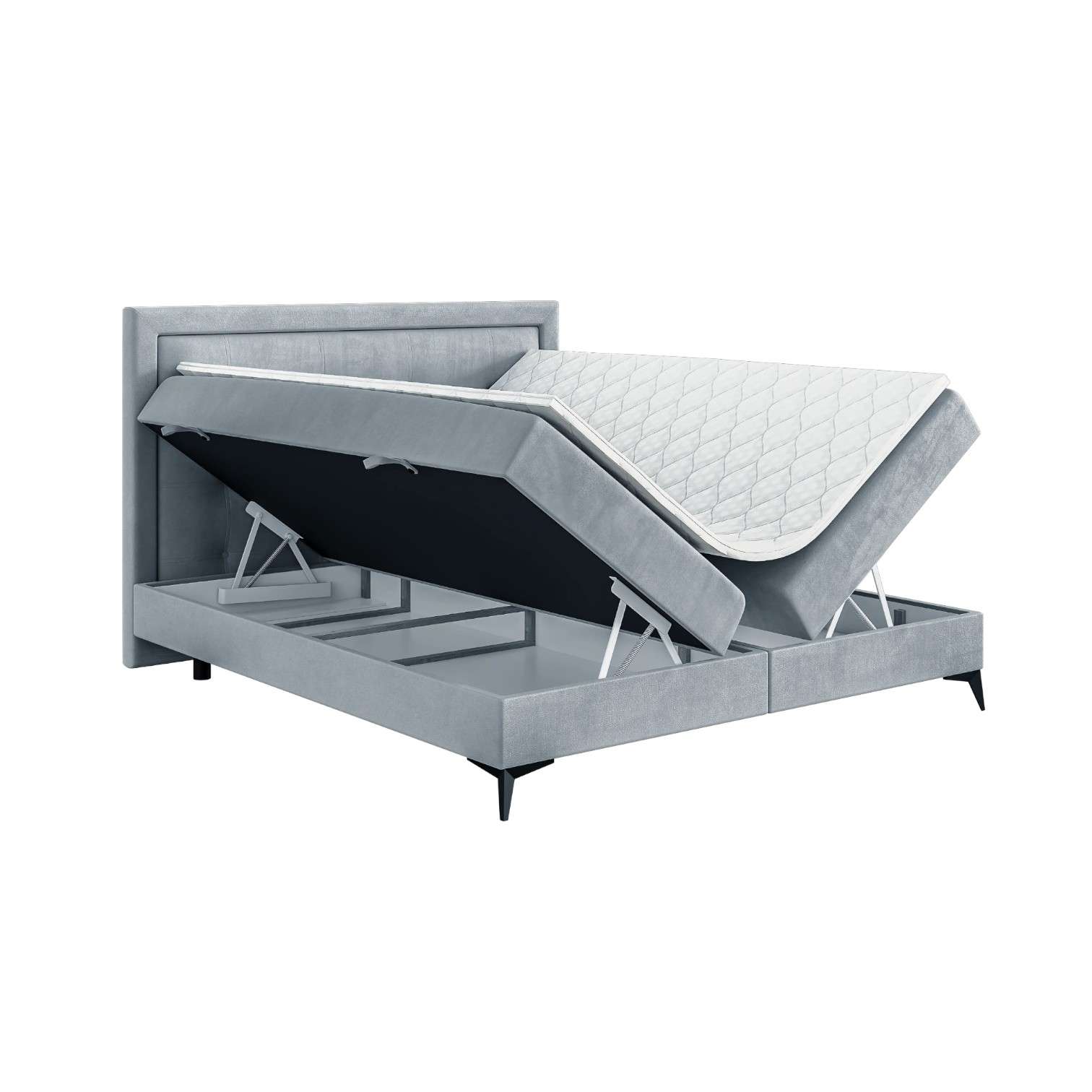 Łóżko FUGO wyposażone jest w dwa osobne pojemniki na pościel, które są wygodnie otwierane na boki dzięki automatom wspomagającym podnoszenie. Dzięki zastosowaniu materaca typu bonell i miękkiego toppera, zapewnia ono stabilne, a zarazem wygodne podparcie ciała podczas snu.