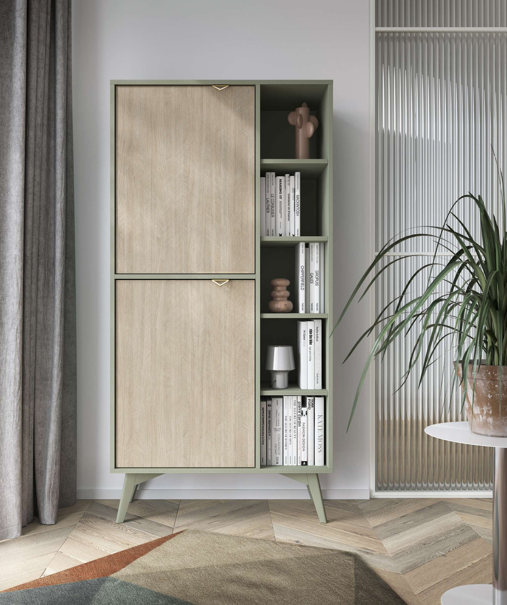 ✅Elegancki design: Komoda ELEGIA KSZ158 wyróżnia się nowoczesnym designem i subtelnym wzorem jodełki scandi, który wprowadzi do Twojego wnętrza przytulną atmosferę.✅Uniwersalny kolor: Kolor eukaliptusa sprawia, że komoda pasuje do różnych aranżacji i łatwo ją dopasować do innych mebli.✅Złote akcenty: Uchwyty krawędziowe w kolorze złota dodają meblu elegancji i sprawiają, że wyróżnia się on na tle innych.