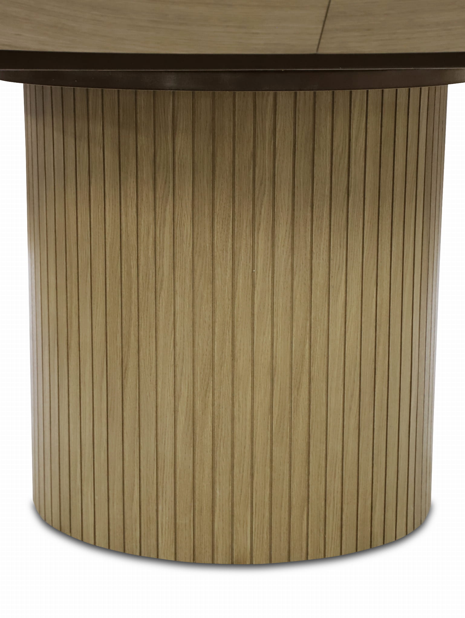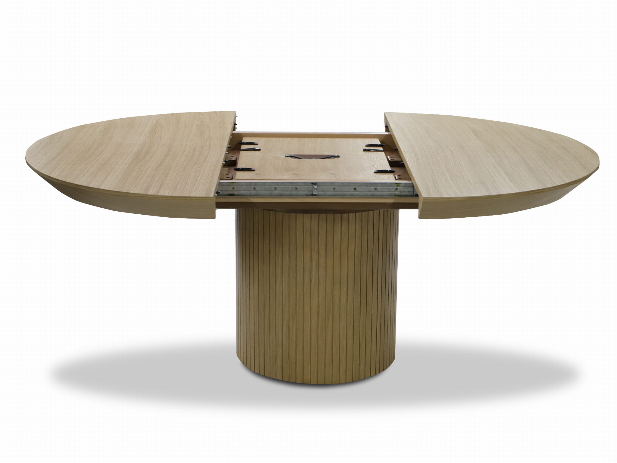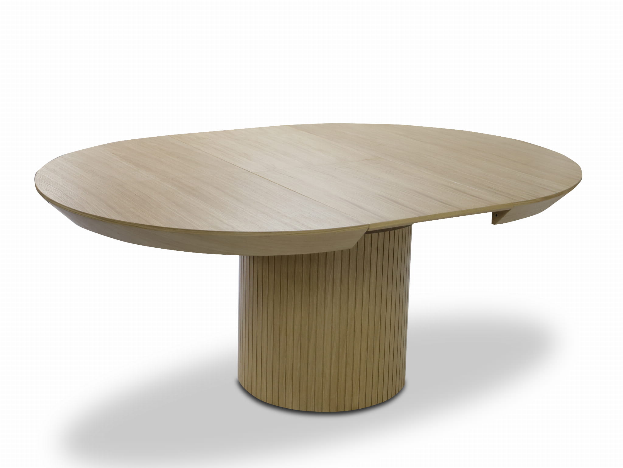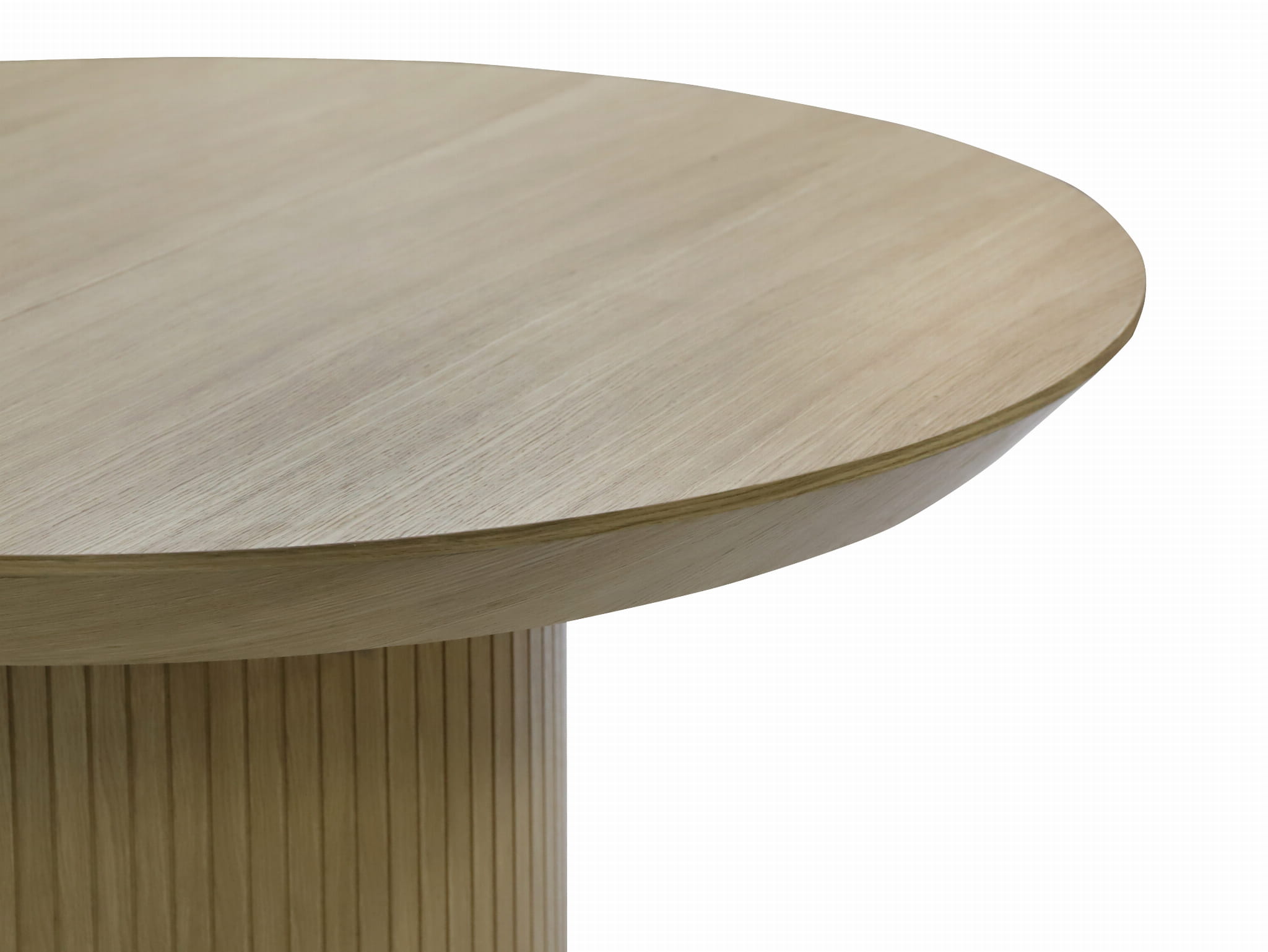 Stół LILITH – Okrągły Stół z ryflowaną nogą pokryty naturalnym fornirem dębowym (130 cm, Rozkładany do 180 cm)