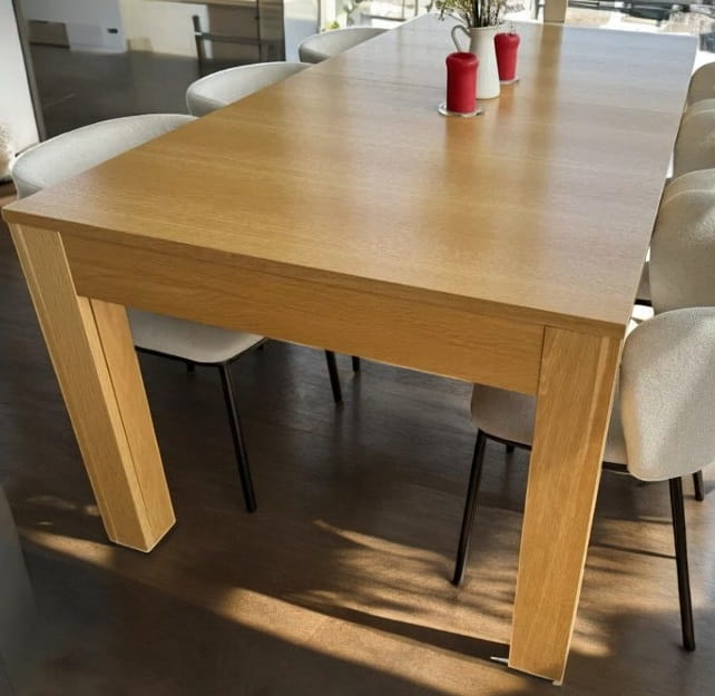 ▪️ Wkładki: Każdy stół posiada sześć wkładek o szerokości 50 cm; cztery wkładki chowane pod blatem oraz dwie, które muszą być schowane poza meblem z powodu braku miejsca w oskrzyni.