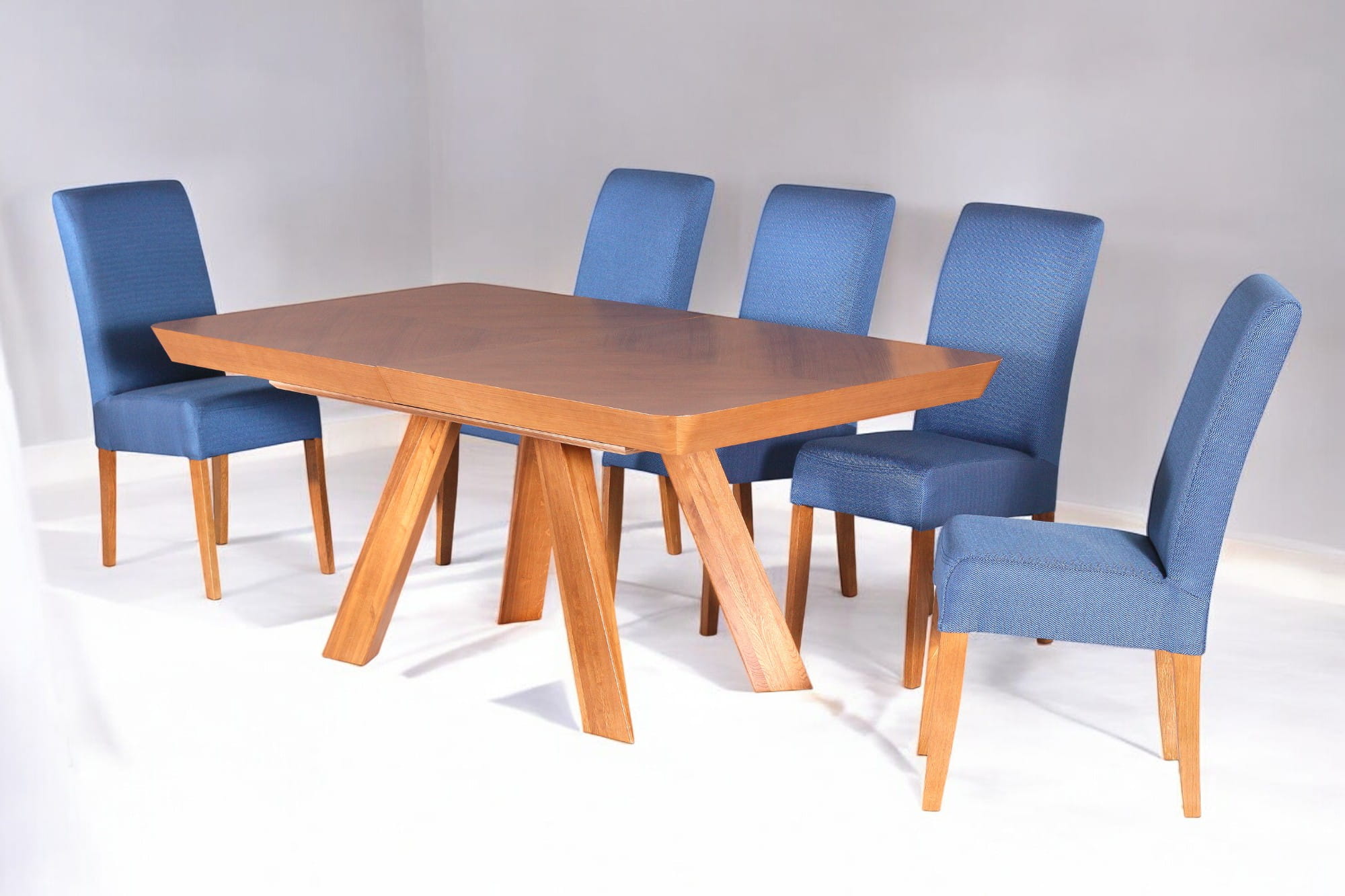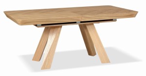 Blat stołu pokryty jest naturalnym fornirem dębowym, nogi olchowym.